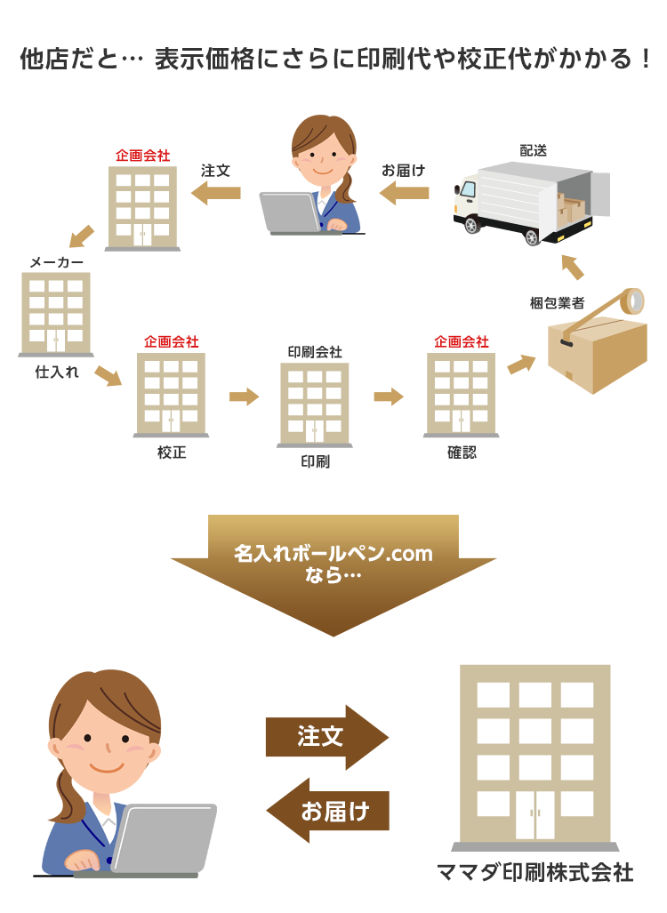 名入れボールペン.comでは一元管理システムだからこそできる価格設定でデザイン・印刷・包装などすべて含めたうえ で表示価格を設定しております。別途いただくのは送料のみです。